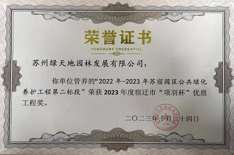 近日,由宿遷市蘇宿園區(qū)建設(shè)發(fā)展有限公司負責(zé)管理的蘇宿工業(yè)園區(qū)2022-2023年公共綠化養(yǎng)護工程第一、二標(biāo)段,同時榮獲2023年度宿遷市“項羽杯”優(yōu)質(zhì)工程獎。
