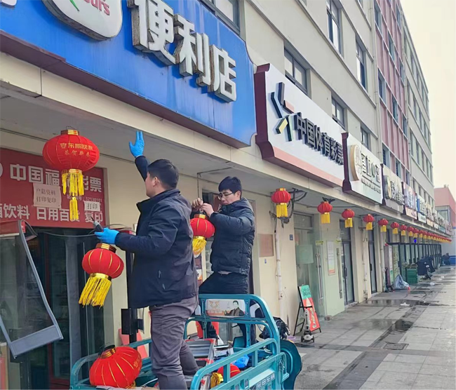 物業(yè)管理部工作人員扛上梯子,拿著燈籠,為沿街商鋪門前掛上了一個(gè)個(gè)大紅燈籠,將我們商業(yè)區(qū)裝點(diǎn)的漂漂亮亮。過年掛燈籠是中國傳統(tǒng)習(xí)俗,紅色代表喜慶,圓形燈籠則寓意團(tuán)圓美滿,紅燈籠象征著平安祥和和紅紅火火。建發(fā)公司希望商鋪們?nèi)兆舆^的紅紅火火,過一個(gè)平安祥和幸福年。