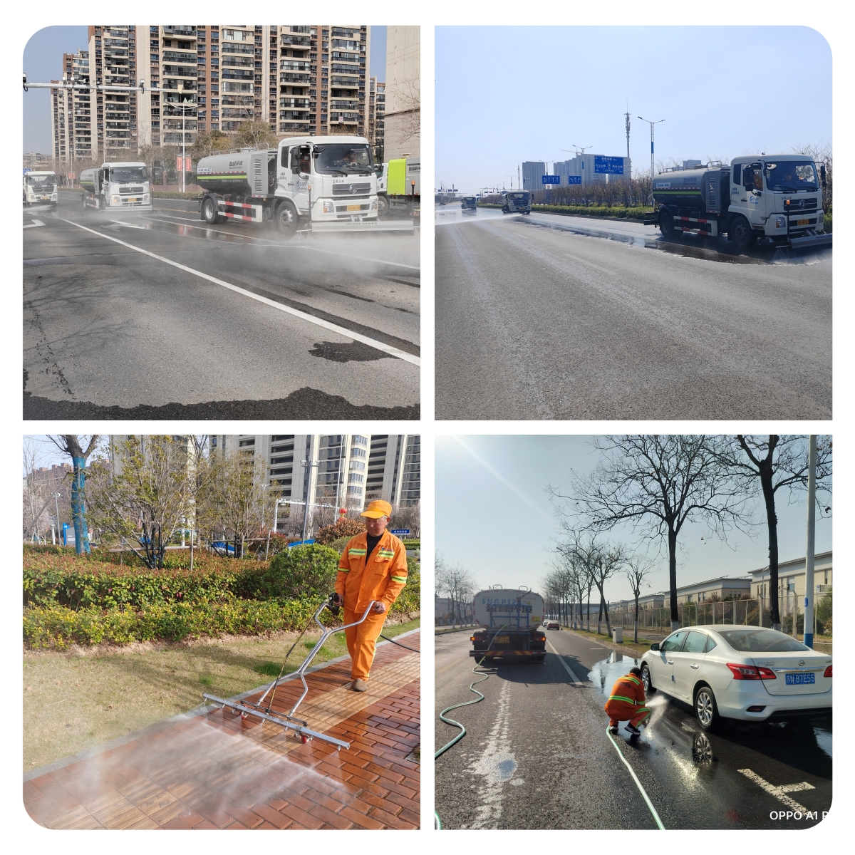 “平面”清洗,“洗”道路本色。采用“洗、沖、刷、掃”組合作業(yè),高壓清洗車、灑水車、洗掃車協(xié)同“作戰(zhàn)”,對園區(qū)主次干道進(jìn)行了深度清洗,確保道路恢復(fù)本色,標(biāo)線清晰。針對人行道、交叉路口、停車泊位等大中型車輛作業(yè)盲區(qū),使用小型高壓清洗車和人工沖洗進(jìn)行“補(bǔ)位”作業(yè),確保無盲區(qū)、無死角,實現(xiàn)清潔全覆蓋,讓園區(qū)每一條道路都“煥然一新”。