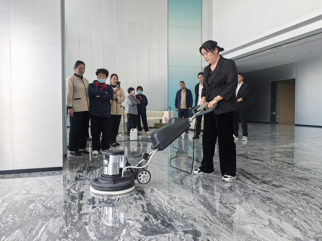 培訓(xùn)圍繞辦公大樓地面清掃、電梯轎廂清潔保養(yǎng)、玻璃幕墻清洗維護(hù)、會議室、茶水間及衛(wèi)生間細(xì)節(jié)處理到外圍路面和綠化區(qū)域的日常清理管養(yǎng)等內(nèi)容,通過觀看視頻和現(xiàn)場演示方式,詳細(xì)講解了操作規(guī)范和作業(yè)標(biāo)準(zhǔn),確保保潔人員能夠熟練掌握高效、科學(xué)的清潔技巧,提高工作質(zhì)量與效率。
