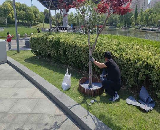 在施工現(xiàn)場,養(yǎng)護人員將回收木樁截取統(tǒng)一長度,精心配色組合使用環(huán)保彩漆涂刷橫截面,將原本單調(diào)的樹穴打造為充滿藝術氣息的“五彩景框”,顯著提升了公園整體景觀效果。